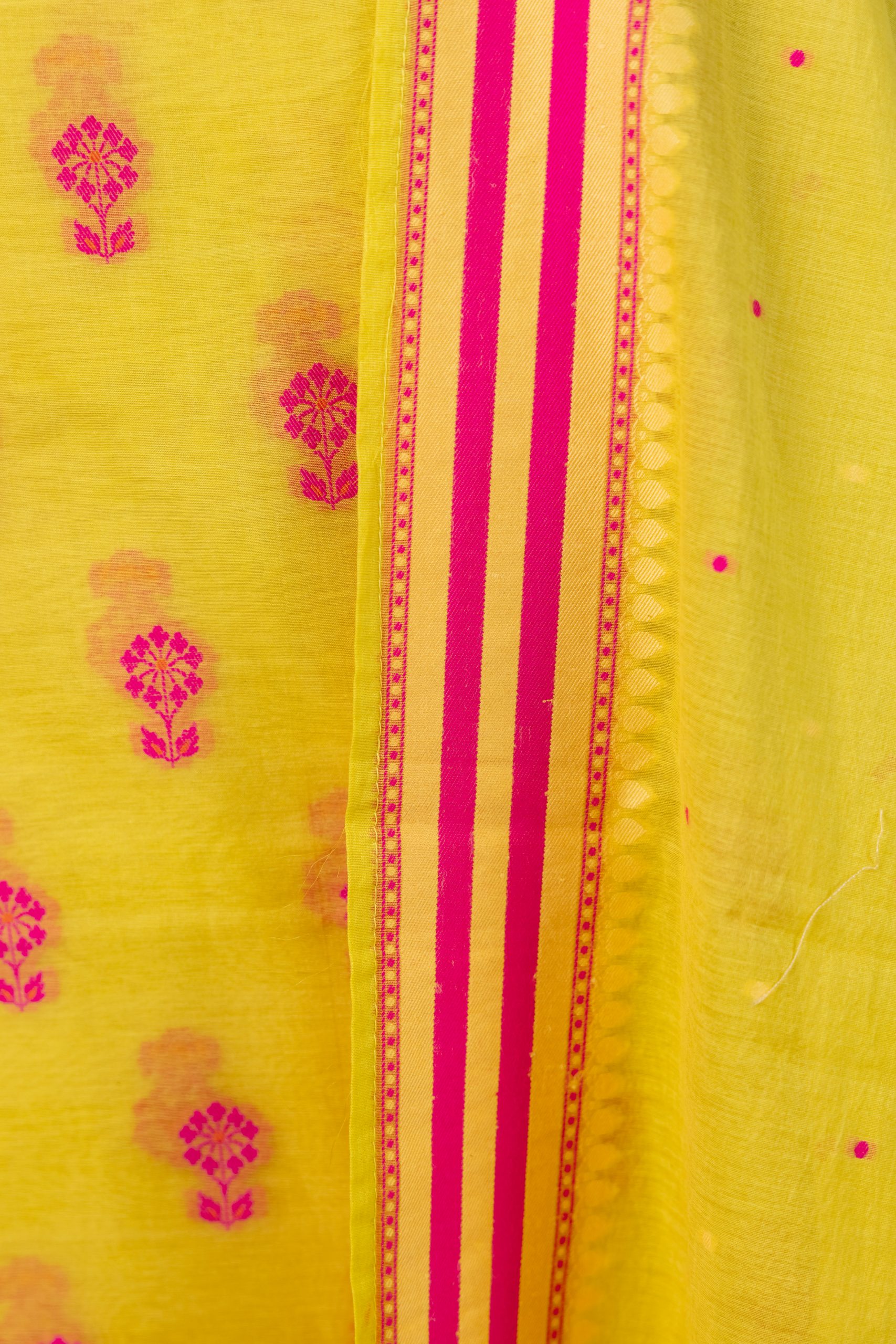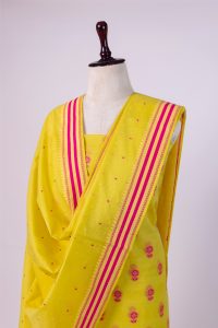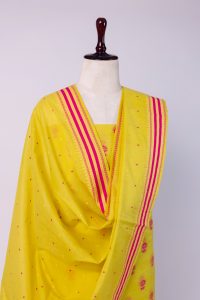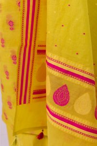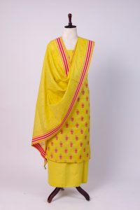 This stunning bright yellow banarasi silk suit , a perfect blend of traditional craftmanship and vibrant colour. This 3 piece unstich suit set is crafted for women loves to celebrate indian heritage with a contemprory spirit. The kurta fabric features yellow silk base adorned with beautifully woven pink meenakari floral bootis scattered all over in a classic repeat pattern