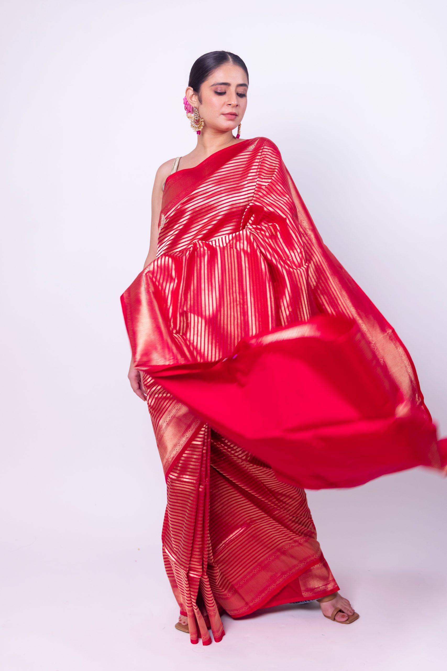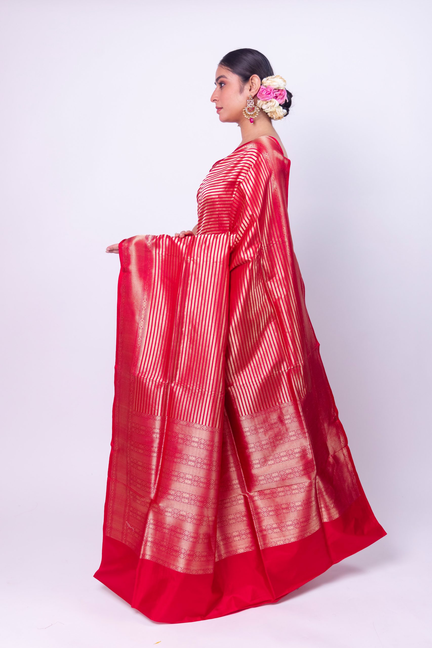 An elegant traditional silk saree in a rich red shade with golden zari detailing. It appears to be made from Banarasi or Kanjivaram silk, known for its luxurious sheen and fine craftsmanship.
