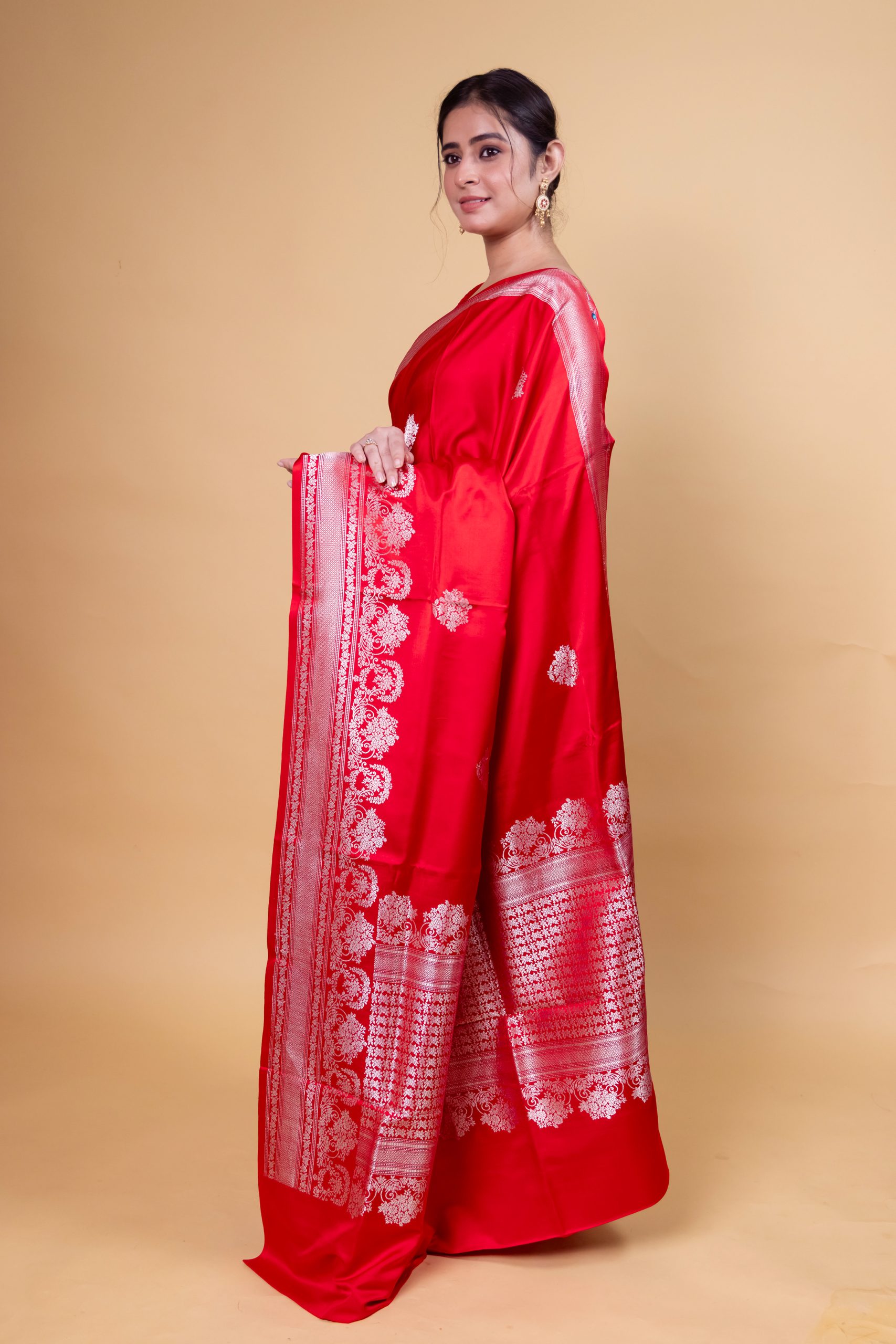 This exquisite red Banarasi silk saree embodies timeless beauty and royal craftsmanship. Woven with precision by skilled artisans from Varanasi, it features intricate silver zari motifs throughout the body and an opulent brocade-style border and pallu.