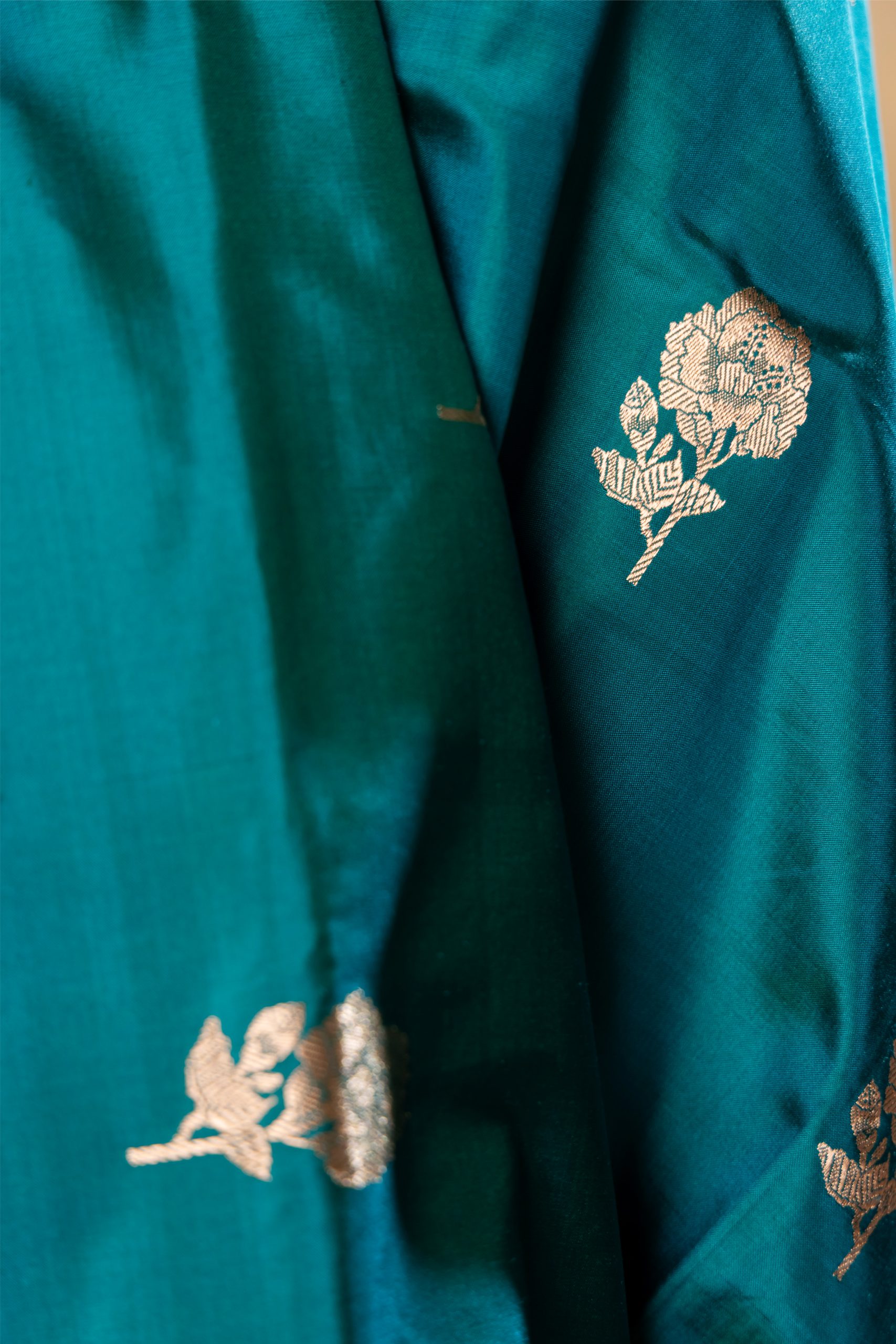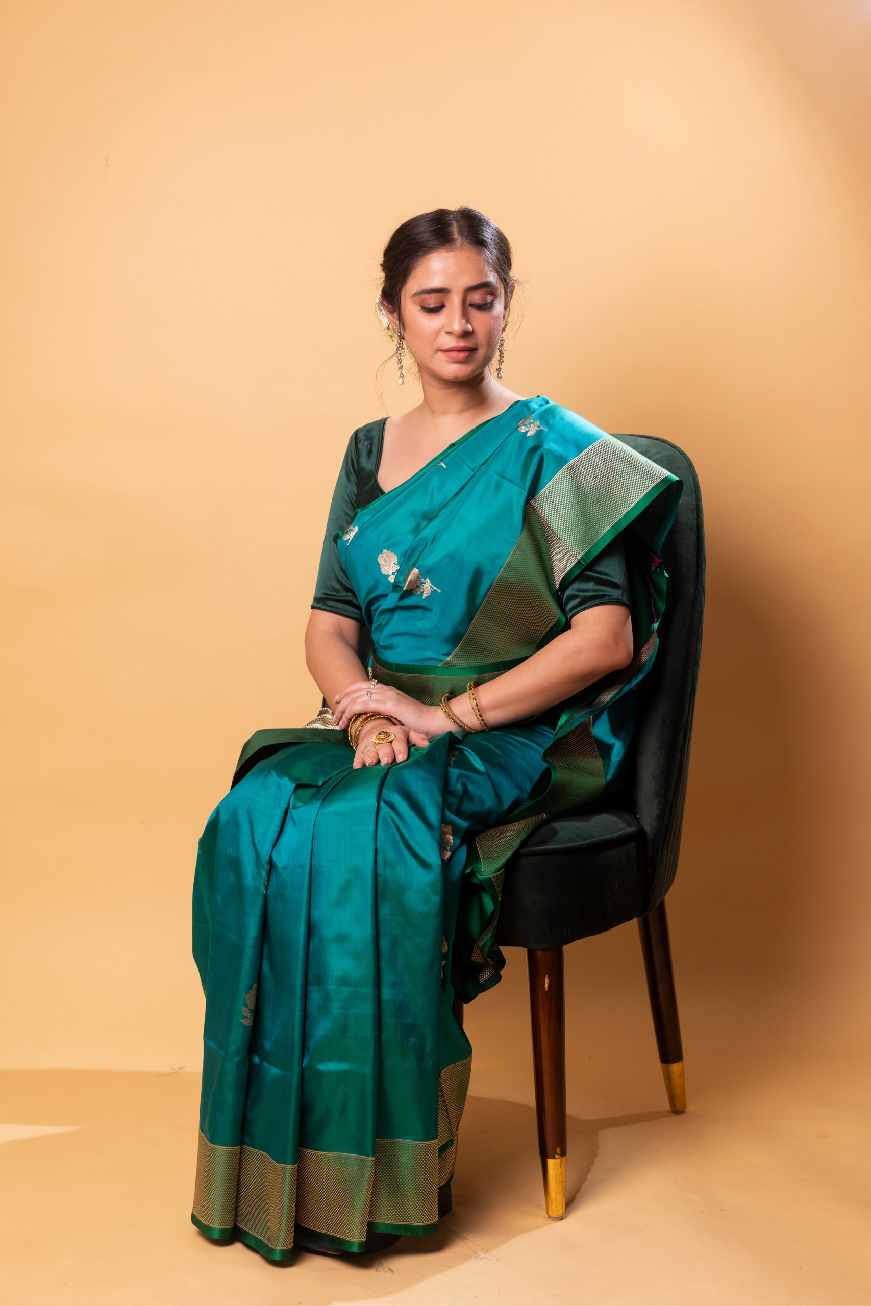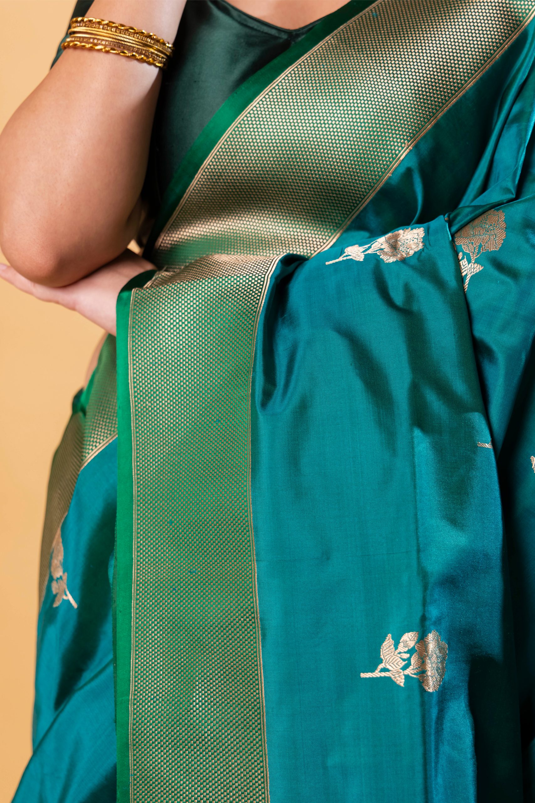 - Color: It features a stunning teal blue-green body with a green and silver zari border, adding a regal touch.